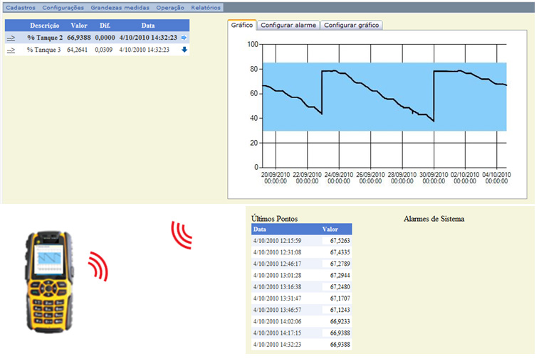 Portal de Serviços: O Portal de Serviços, além de disponibilizar a observação de todos os pontos monitorados, permite as configurações dos alarme e o cadastro dos responsáveis para o envio dos Alarmes Automáticos. O envio dos alarmes é realizado através de SMS ou E-mail. Utilizando-se um celular, é possível a qualquer instante se saber o nível de qualquer tanque monitorado.
